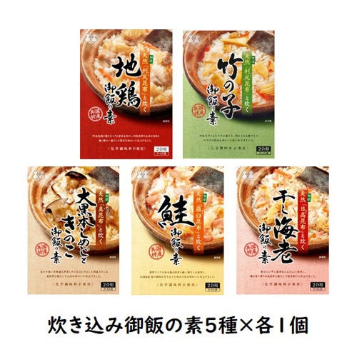 各具材に一番合った出し昆布が付いていますので、昆布の旨味をしっかり味わえます。コクのある地鶏御飯の素、旨味の強い大黒本しめじときのこ御飯の素、香ばしい味わいの干し海老御飯の素など、5種の味を食べ比べできる贅沢なセットです。各2合用(3~4人前)となります。