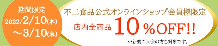 不二食品株式会社(本社:大阪市港区、代表取締役社長:藤井隆義)は、日頃の感謝を込めて、不二食品公式オンラインショップ(https://fujishokuhin-onlineshop.jp/)にて、2月10日~3月10日までの期間、会員様限定全商品10%OFFの特別セール開催致します。この機会に新規ご入会されました方も対象となります。