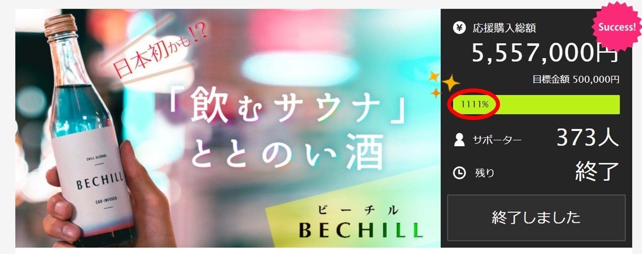 2021年11月13日(土)から2021年12月17日(金)まで実施したクラウドファンディングでは、開始13時間で目標金額を達成し、最終的には目標の1,111%となり、CBD商品史上最高金額の応援購入をしていただきました。応援購入者は、首都圏在住の20代から30代半ばまでのミレニアム世代、男女比は8:2と男性が多く、CBDでチルるアルコール飲料が評価されました。
