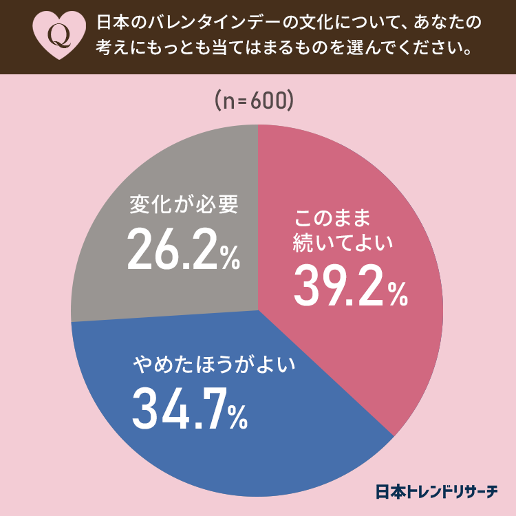 日本のバレンタインデーの文化については、「このまま続いてほしい」方がいる一方で、「やめたほうが良い」「変化が必要」だと感じている方も少なくないようです。