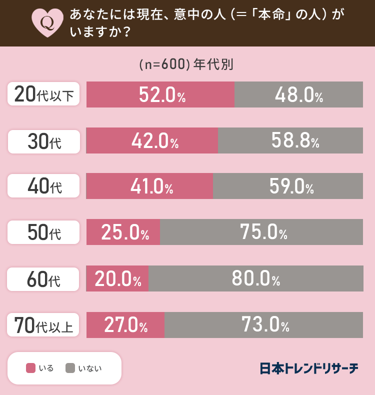40代以下では本命の人が「いる」方が多く、特に20代以下の方は半数以上が「いる」と回答していました。