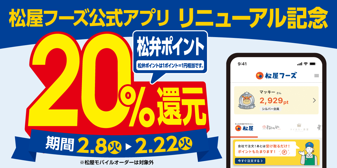 | ▽キャンペーン期間 2022年2月8日(火)0時~2022年2月22日(火)23時55分 ▽キャンペーン内容 ▽対象店舗 ▽ポイントの利用 ▽新規会員ご登録で100ポイントプレゼント! ※事前決済には、クレジットカード・PayPay・LINE Pay・d 払い・au PAY・メルペイがご利用いただけます。 券売機でお買い求めいただくよりもお得となっております。ぜひご活用・ご登録いただきお買い求めください。 ▽松屋フーズ公式アプリ http://www.matsuyafoods.co.jp/mobile |
