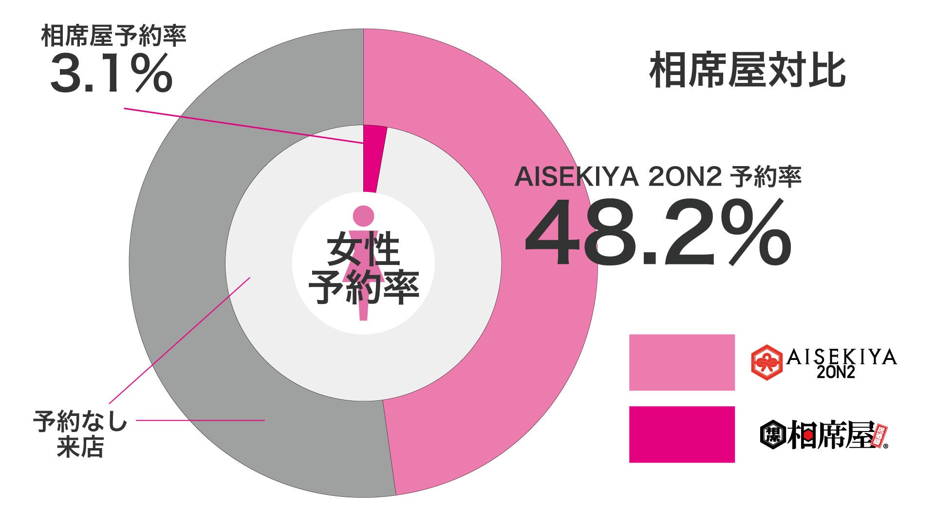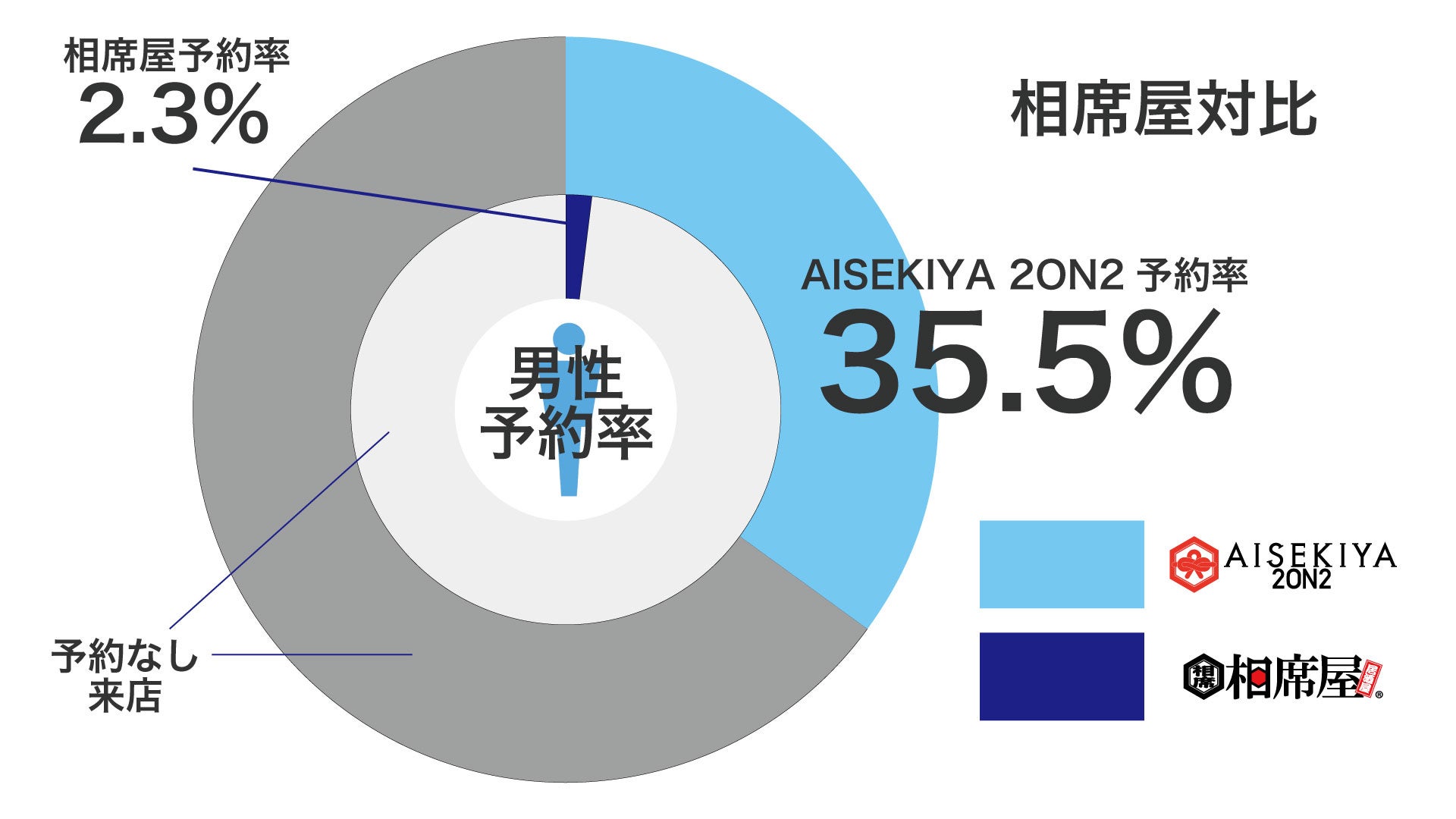 またAISEKIYA 2ON2への来店予約率は、男性が35.5%、女性が48.2%となっていました。相席屋の来店予約率は男女ともに2.0〜3.0%のため、AISEKIYA 2ON2への来店予約率が男女ともに高いことがわかります。特に女性は来店の約半分が予約してから来店していることになります。