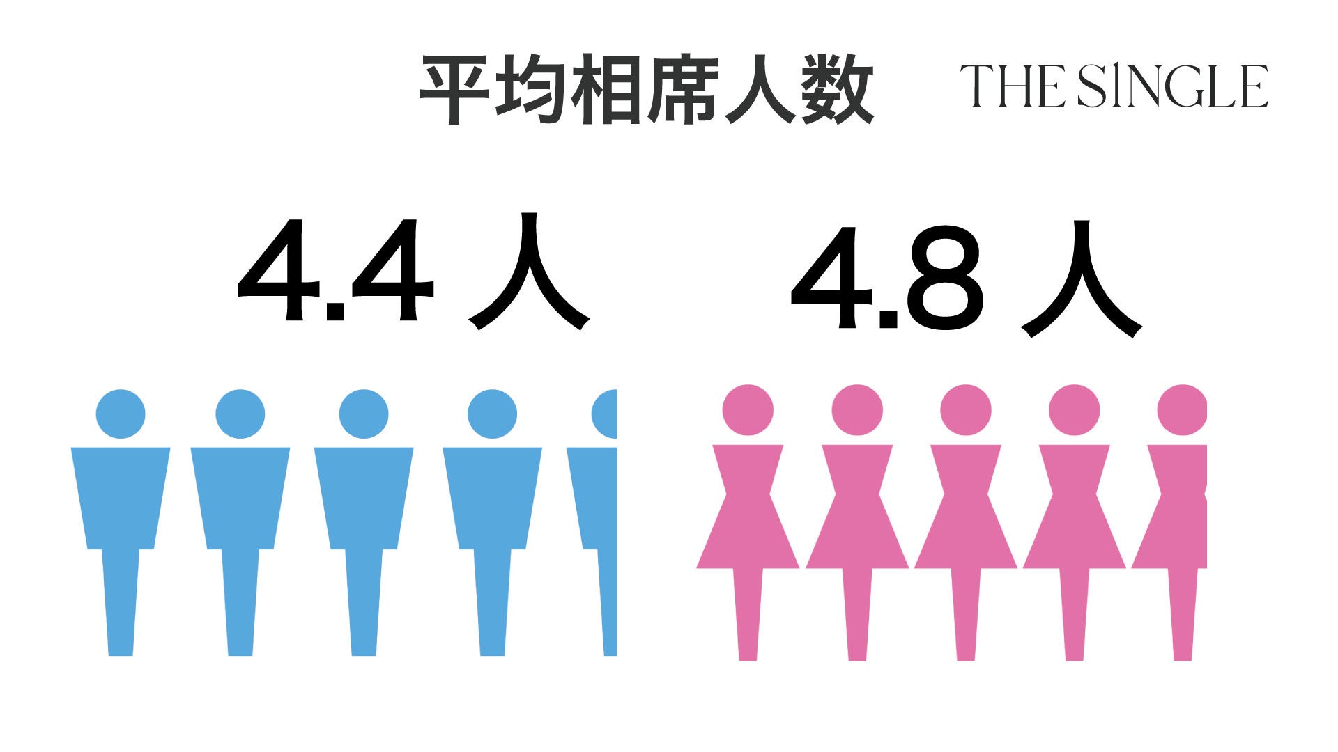 2022年1月のTHE SINGLEの平均相席人数は男性は4.4人女性は4.8人となりました。2022年1月も2021年度に引き続き、1対1で1日に男女ともに4〜5人の方と出会えているという結果になります。