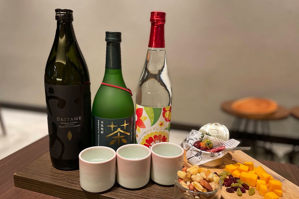 アップルマンゴーを想わせる「華プラス」や、2019IWSCで最高賞を受賞したライチ香る「だいやめ」、さらに2021TWSC 焼酎部門にて2年連続で最高金賞を受賞した「知覧Tea酎」などの芋焼酎3種類をおちょこでご提供。おつまみは、オリーブマリネやチーズ、ドライフルーツなど、焼酎にぴったりの5種盛りをお付けします。