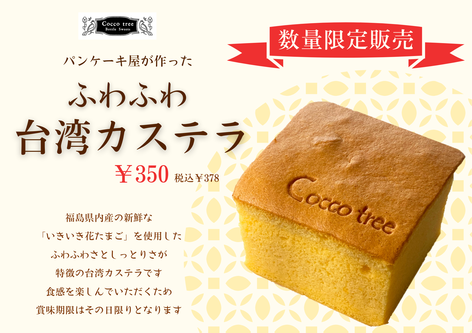 ㈱河京Cocco tree(本社:福島県喜多方市、代表取締役:佐藤富次郎)は、新商品「台湾カステラ」の販売を開始しました。毎週土日月曜日の限定販売、数量限定の台湾カステラをどうぞお楽しみください。