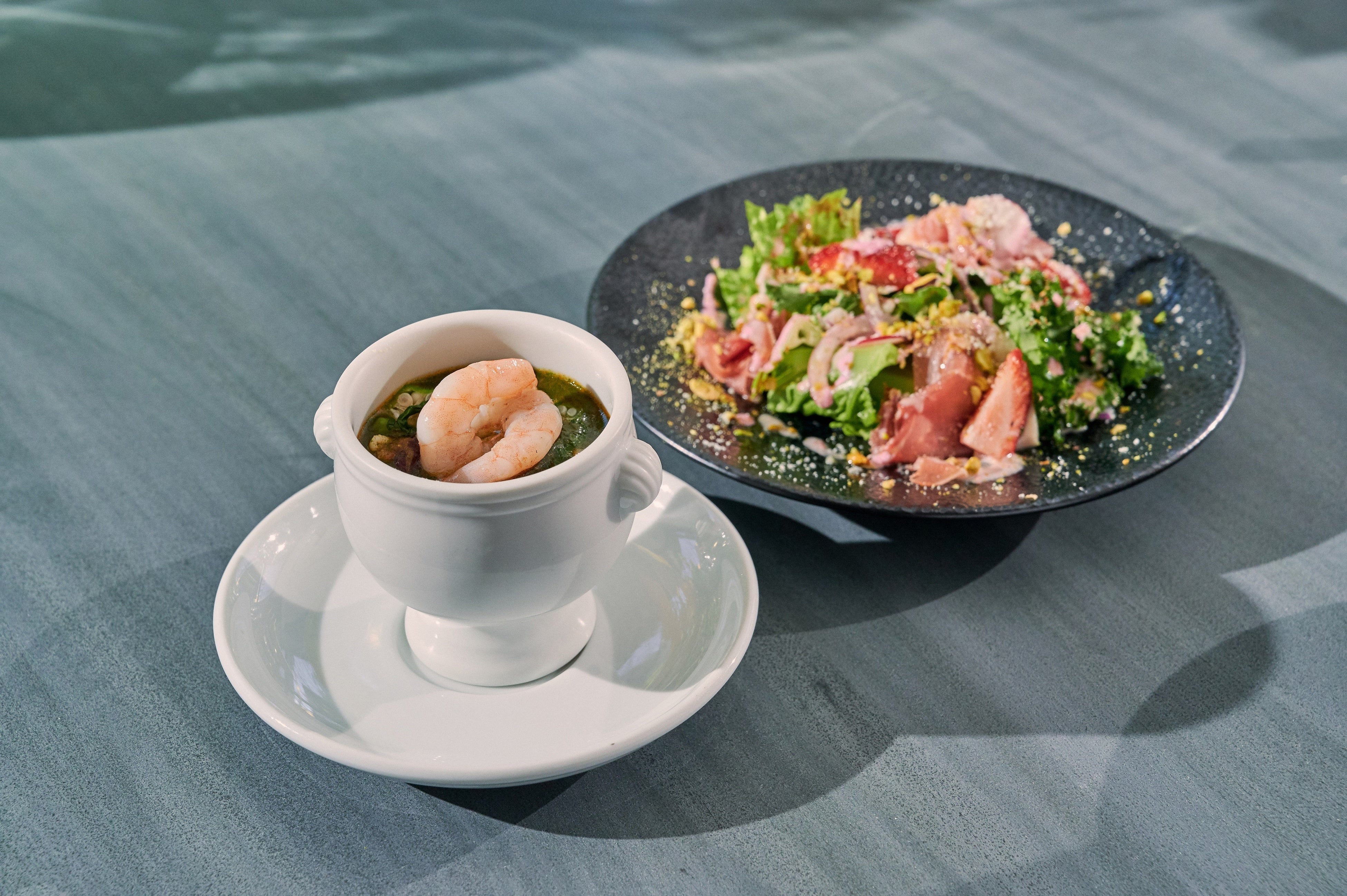 イチゴと生ハムのサラダ ストロベリーソース ピスタチオロースト