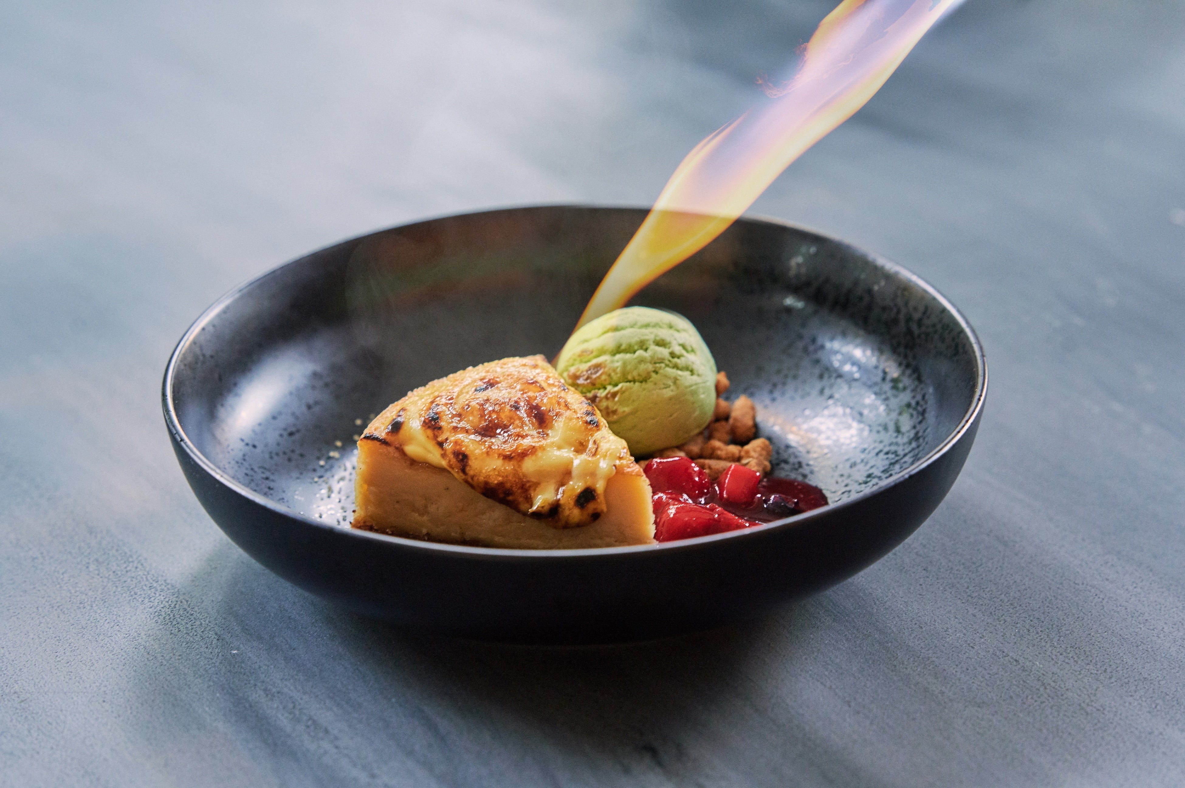 さらに、目の前で炙って仕上げるチーズケーキもオプションにてご用意。カラメリゼの香ばしい香りと、とろけるような食感をご堪能ください。
