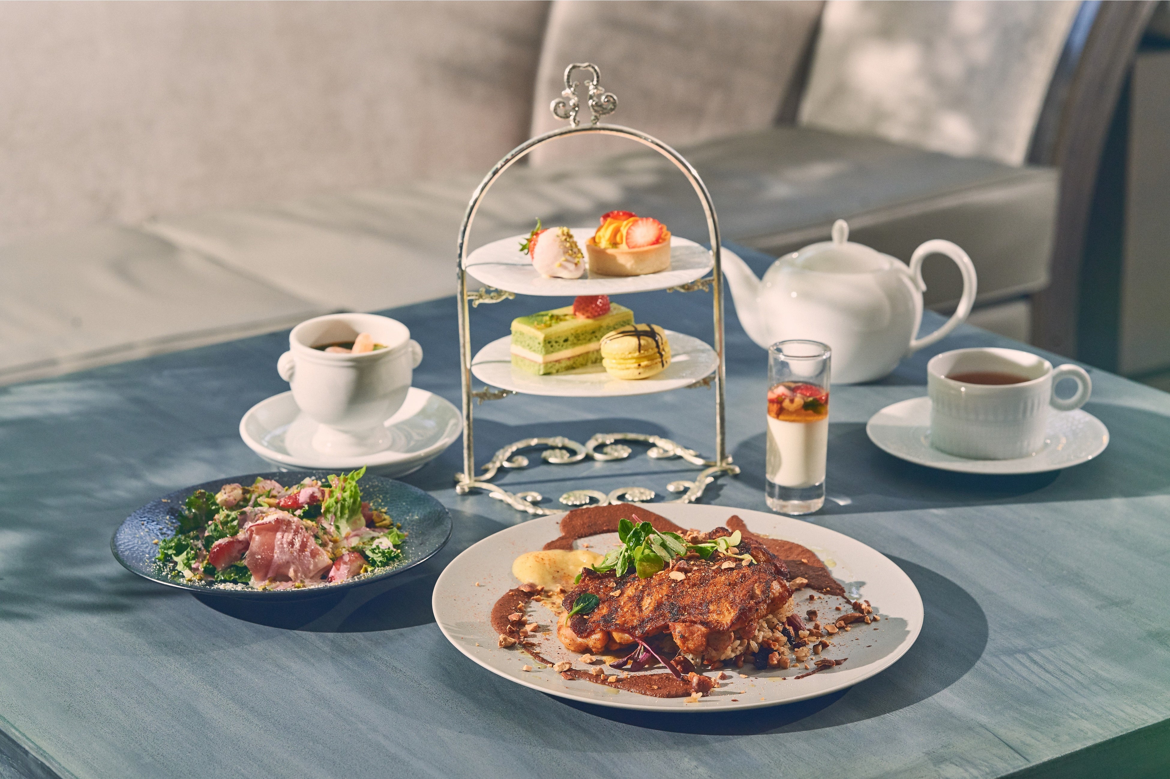 セイボリーでは、ストロベリーソースとピスタチオのローストをあしらったサラダや、はちみつでマリネししっとり仕上げたTAVERN特製のグリルチキンをお楽しみいただけます。