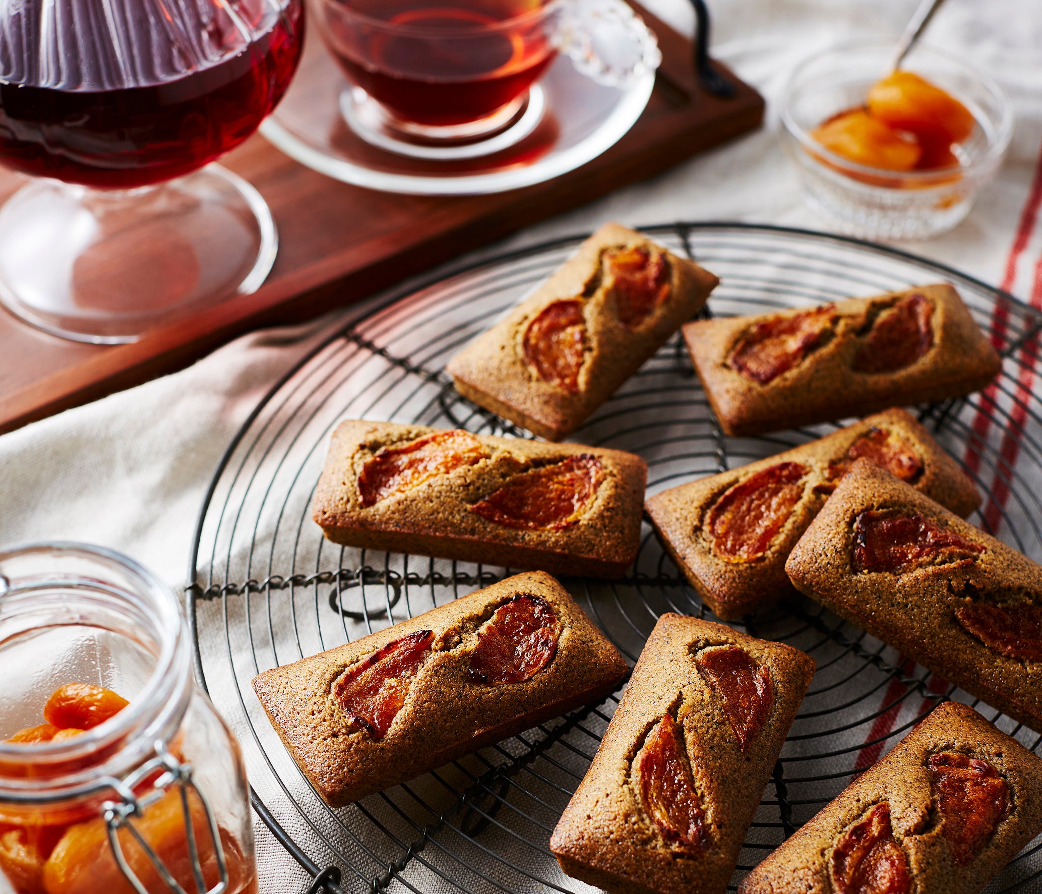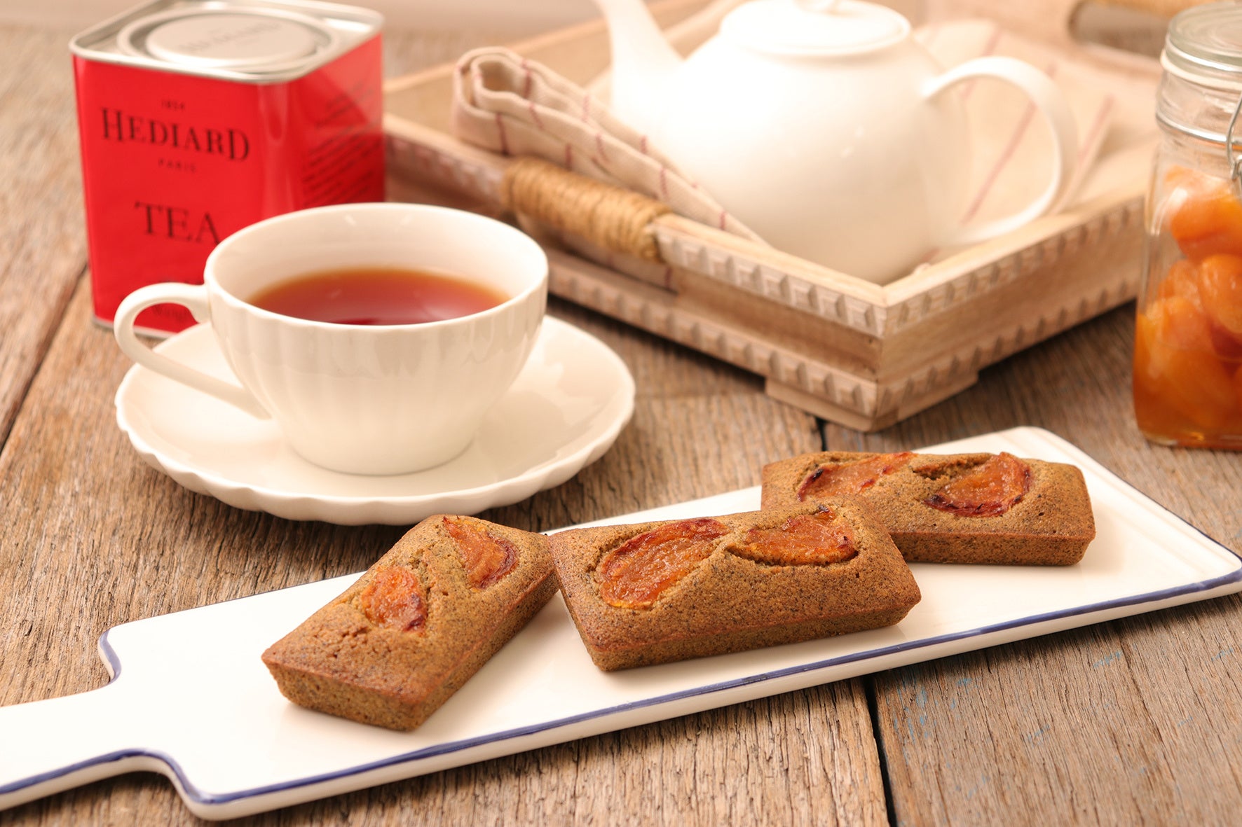 『焼きたてフィナンシェ(エディアールブレンド)』は、柑橘系の爽やかな味わいが特徴の茶葉を細かく砕き、アーモンドと焦がしバターの香り豊かなフィナンシェ生地に合わせて焼き上げています。アプリコットブランデーにひと晩漬け込んだセミドライアプリコットの爽やかな酸味が、香り高いフィナンシェ生地と相性抜群です。