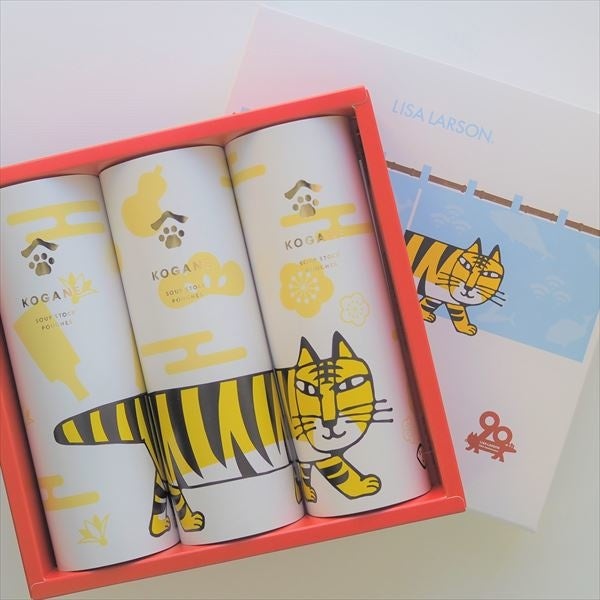 人気No.1ギフト『KOGANE』と、陶芸家リサ・ラーソンさんが生んだ人気の猫キャラクター「マイキー」のコラボ商品で、今年の干支にちなんだトラをモチーフにしたパッケージ。