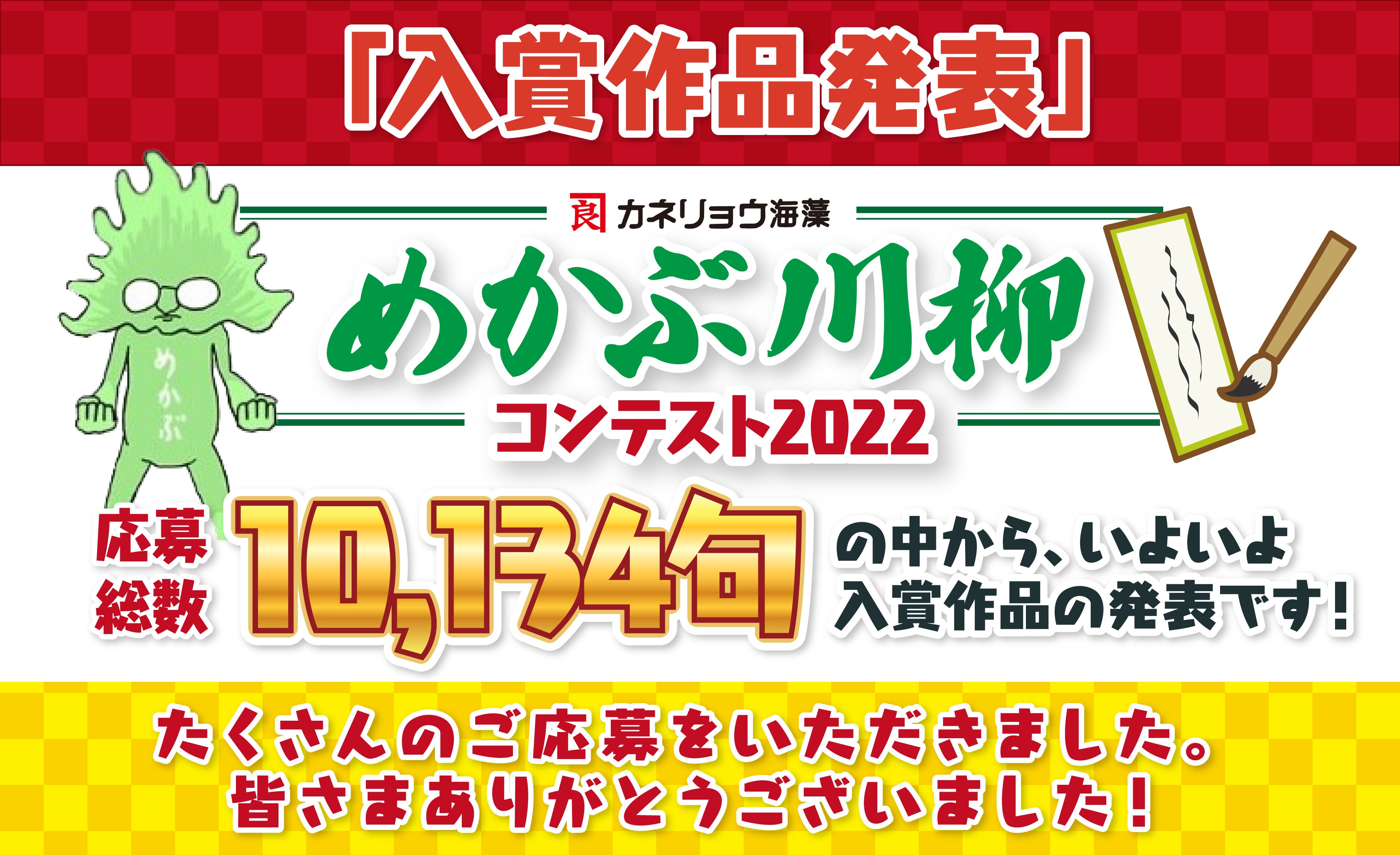 海藻の総合メーカーであるカネリョウ海藻株式会社(代表取締役社長:高木良樹 所在地:熊本県宇土市笹原町1544)は、2022年2月14日の「めかぶの日」のキャンペーンの一環として、『めかぶ川柳コンテスト2022』を開催。応募総数10,134句の応募(作品数)が寄せられ、厳選なる審査の結果、受賞作品6句が決定いたしました。