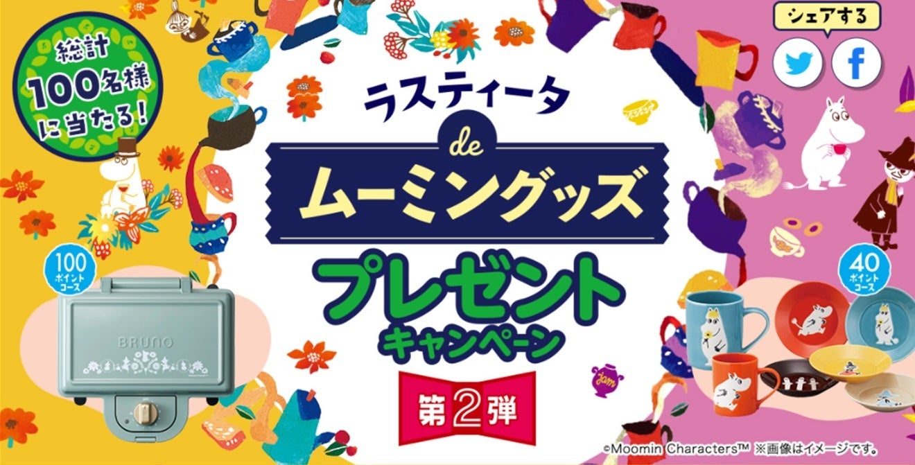 『ラスティータ』を対象に商品裏面についている応募券を集めてご応募いただいた方の中から抽選で総計100名様に「ムーミン」グッズが当たるプレゼントキャンペーン第2弾を実施します。100ポイントコースはかわいい焼き目が付けられる「ムーミン ホットサンドメーカー」、40ポイントコースはラスティータとともに優雅でくつろぎのティータイムを演出する「ムーミン マグカップ2個&ファイブプレートセット」。詳しくはキャンペーンページをご覧ください。