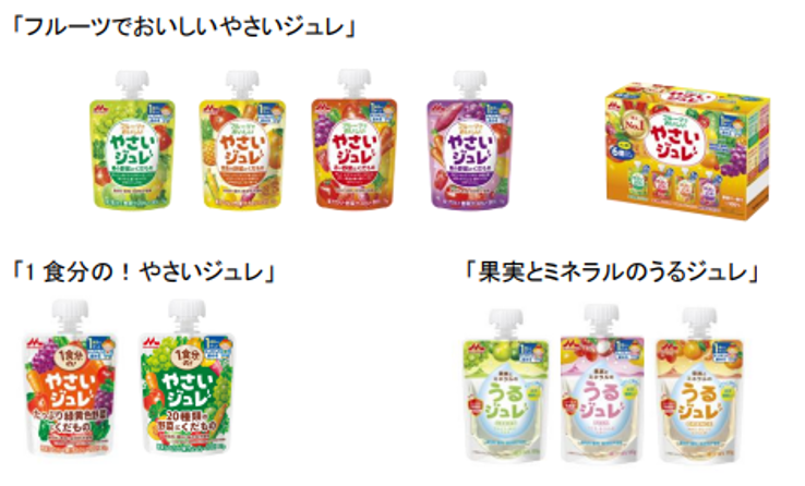 ベビーフード液体果汁ジュース市場No.1※1ブランドの「森永ジュレ」シリーズは、“子どもに野菜を積極的にあげたい”、“野菜が入っているおやつがあれば買いたい”というママのための、着色料、香料、保存料不使用、 “野菜汁+果汁=100%”のゼリー飲料「フルーツでおいしいやさいジュレ」として2015年に誕生しました。その後、野菜の配合割合を高めた「野菜を!もっと!やさいジュレ」が仲間入りし、さらに機能性素材シールド乳酸菌®を配合した「果実とミネラルのうるジュレ」とラインナップを拡充し、お子さまを持つ多くのご家庭に支持されております。