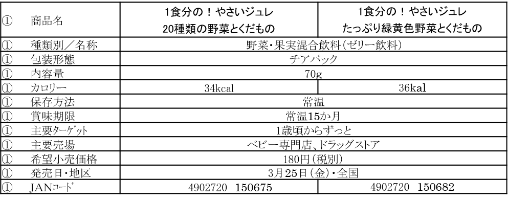 このたび「野菜を!もっと!やさいジュレ」のシリーズを「1食分の!やさいジュレ」にリニューアルいたします。「20種類の野菜とくだもの」の野菜汁の配合割合を高め、いずれも1袋で50g以上の野菜汁とし、1食分の野菜(生後12-18か月の離乳食における野菜摂取の目安量は40-50g※2)を摂ることができます。