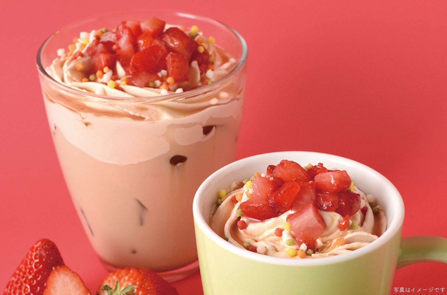 キャラメルソースとホイップのまろやかな甘みが、春のうららかなお日様をイメージさせるロイヤルミルクティーです。甘酸っぱいいちごと、花畑のようにカラフルなあられをトッピングし、見た目も華やかに仕上げました。