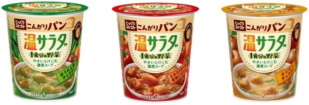 2018年以降、野菜訴求のカップ入りスープ市場は、151%と大幅に拡大し※2、「じっくりコトコトこんがりパン1食分の野菜」シリーズも、市場の広がりともに、大きく伸長してきました。今回、スープをサラダ感覚でお召しあがりいただけるよう「じっくりコトコトこんがりパン温サラダ」と名前を変更し、中身設計も見直しました。「温かいサラダ」をコンセプトに、刷新前と比べ、使用している野菜の種類を増やし、野菜の濃厚さと美味しさ・野菜の食感と素材がより感じられる味わいへと魅力を高めました。“ほうれん草チャウダー”“ミネストローネ” “オニオンチャウダー”の3種類のラインナップで、すべて「1食分の野菜※3」入りです。野菜が溶け込んだスープで、体を温めながらサラダ感覚で手軽に野菜が摂れる商品として価値をお伝えすることで、「じっくりコトコト」ブランドの活性化を図っていきます。