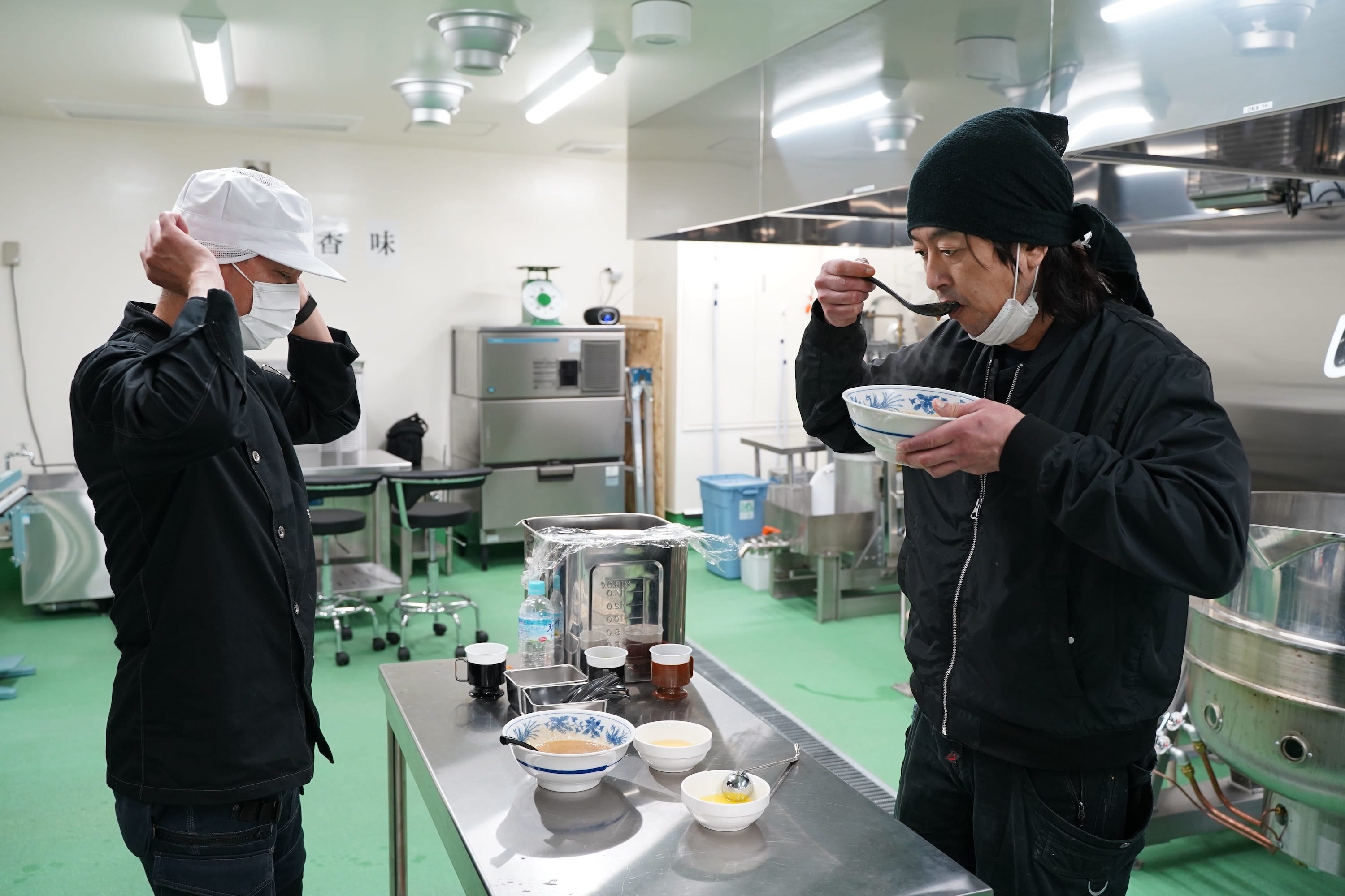 【写真1】品質チェックの様子。左:クラウドキッチン事業部部長 高田也人、右:『濃麺海月』店主 北村裕之氏
