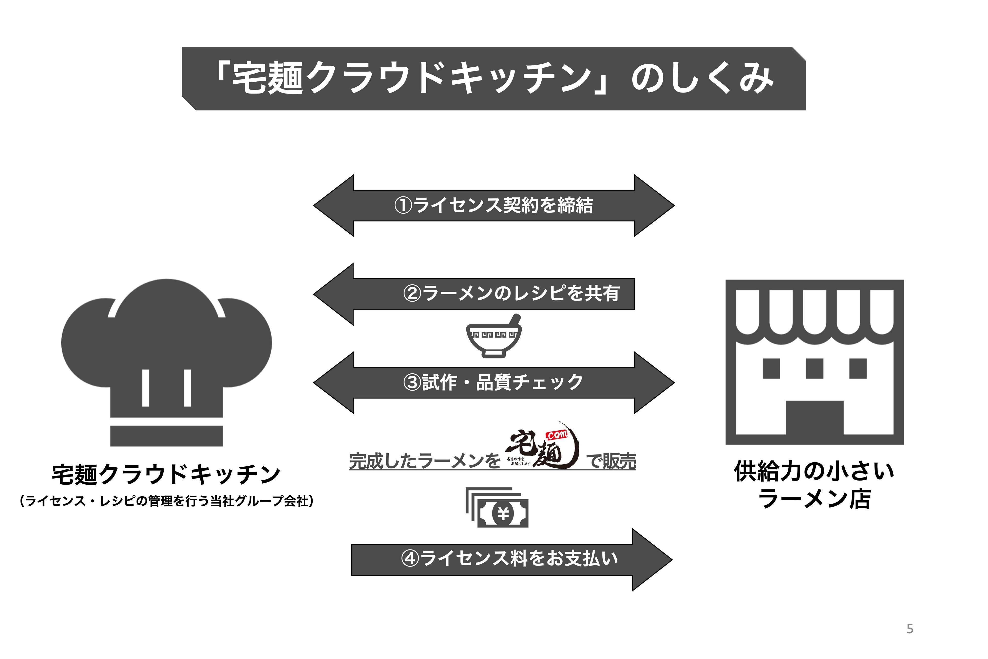 また、将来的には「宅麺クラウドキッチン」での大量生産向けに再構築したラーメンのレシピを用いることでラーメン店の海外展開のハードルを下げ、特に個人経営の有名ラーメン店の海外展開、ひいては収益の拡大を促進できると考えています。
