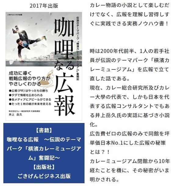 日本で唯一のカレー専門のコンサルティング会社である株式会社カレー総合研究所(所長:井上岳久/東京都渋谷区)は、所長の井上岳久が井上戦略PRコンサルティング事務所代表として日本を代表する広報PRコンサルタントとして有名ですが、この度、自身24冊目となる著書『メディアに取り上げられ急成長を実現する究極の経営! 「戦略広報経営法のススメ」』をエベレスト出版から発刊しました。