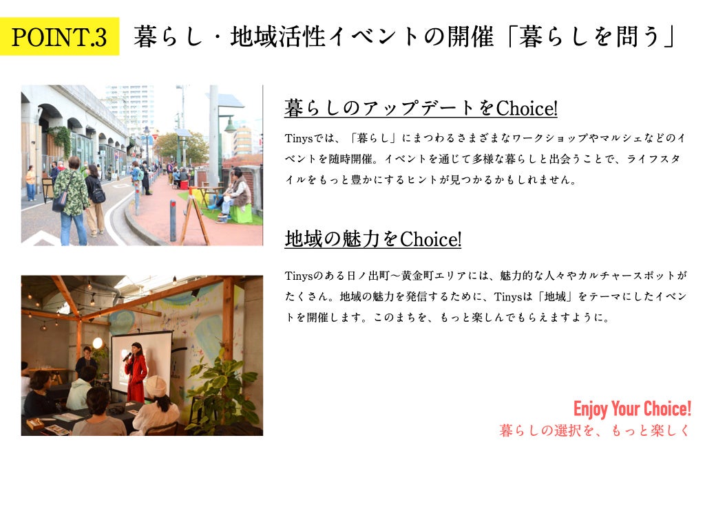 そしてTinysの使命である横浜市日ノ出町・黄金町エリアをさらに活性化させ、ニューカルチャーが生まれる持続可能なまちとして、より多くの皆様が来訪するきっかけを創出してまいります。