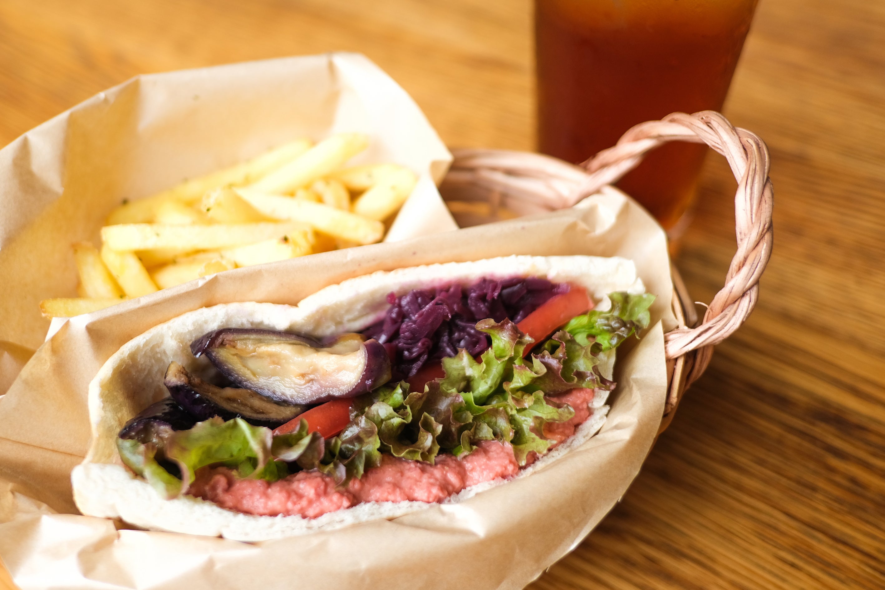 栄養価の高いひよこ豆をペーストにして、ビーツやごまを練り込んだフムスをサンドしました。ヘルシーなのに濃厚でクリーミーな味わいが、クセになる一品です。
