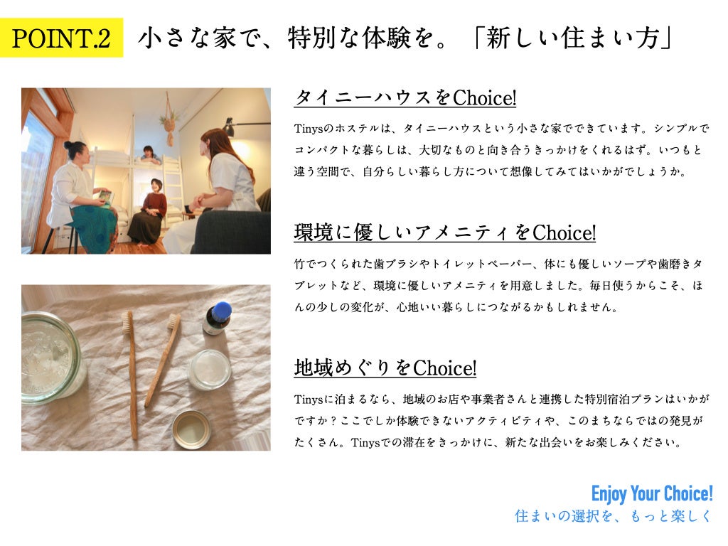 タイニーハウス・VAN・空き家などの新空間プラットフォーム事業を展開するYADOKARI株式会社(本社:神奈川県横浜市 / 代表取締役CEO さわだいっせい・代表取締役COO ウエスギセイタ)が運営する高架下タイニーハウス複合施設「Tinys Yokohama Hinodecho(タイニーズ横浜日ノ出町)」は2022年3月2日(水)、新テーマ『Enjoy Your Choice!暮らしの選択を、もっと楽しく』の下リニューアルオープンいたします。