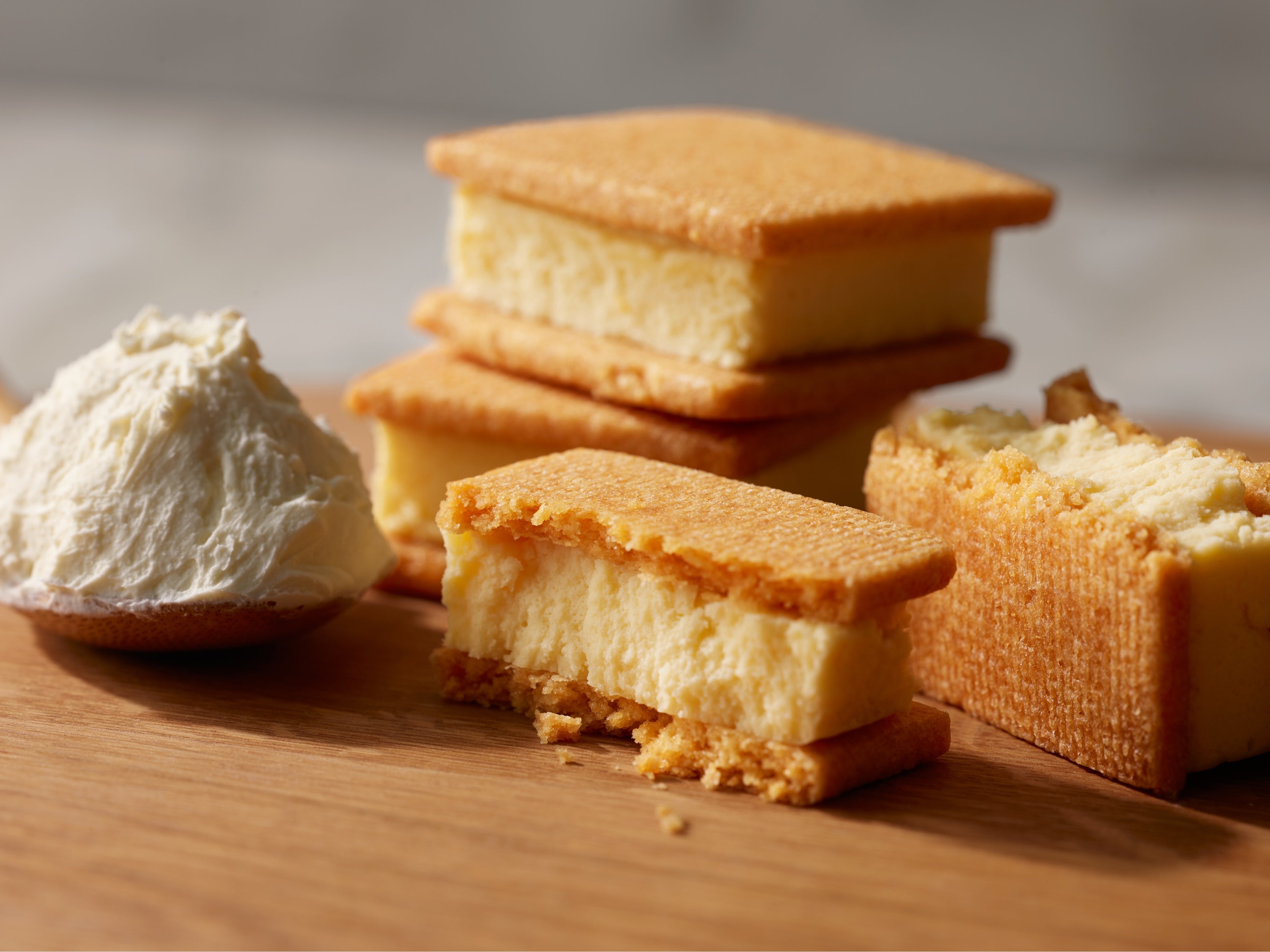 北海道産の生クリームとオーストラリア産のクリームチーズを使用し、じっくりと低温で焼き上げたなめらかなチーズケーキを、しっとりとしたサブレでサンドしました。