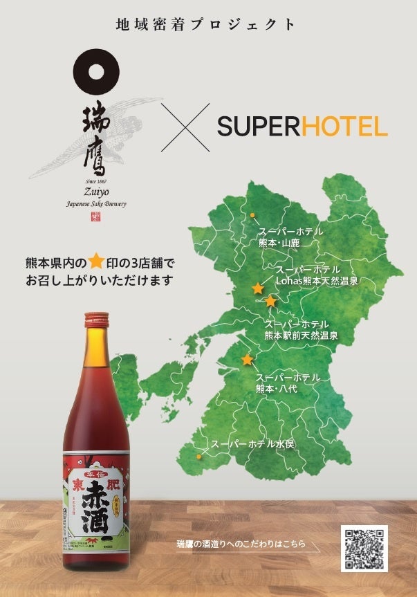「Natural, Organic, Smart」をコンセプトに国内167店舗のホテル運営を⼿掛ける株式会社スーパーホテル(本社:大阪府大阪市、代表取締役社長:山本健策)と、瑞鷹株式会社(本社:熊本県熊本市、代表取締役社長:吉村朋晃)が提携し、2022年2月18日(金)にオープンするスーパーホテル熊本駅前天然温泉をはじめとした3店舗のウェルカムバーにて熊本の地酒を提供します。さらに、新店舗の無料宿泊券と瑞鷹の日本酒が当たるSNSキャンペーンを開催し、熊本の地域活性化に取り組みます。