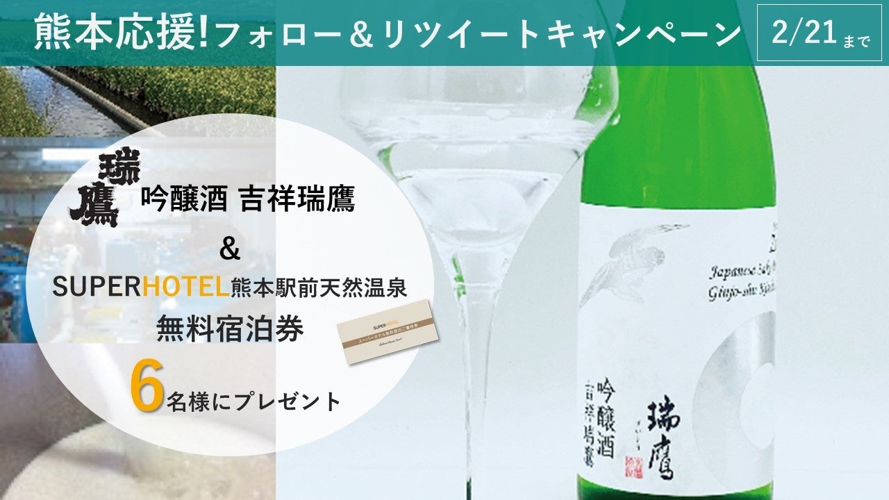 「吟醸酒 吉祥瑞鷹(720ml)1本」と「スーパーホテル熊本駅前天然温泉 無料宿泊券1枚」を抽選で6名様にプレゼント