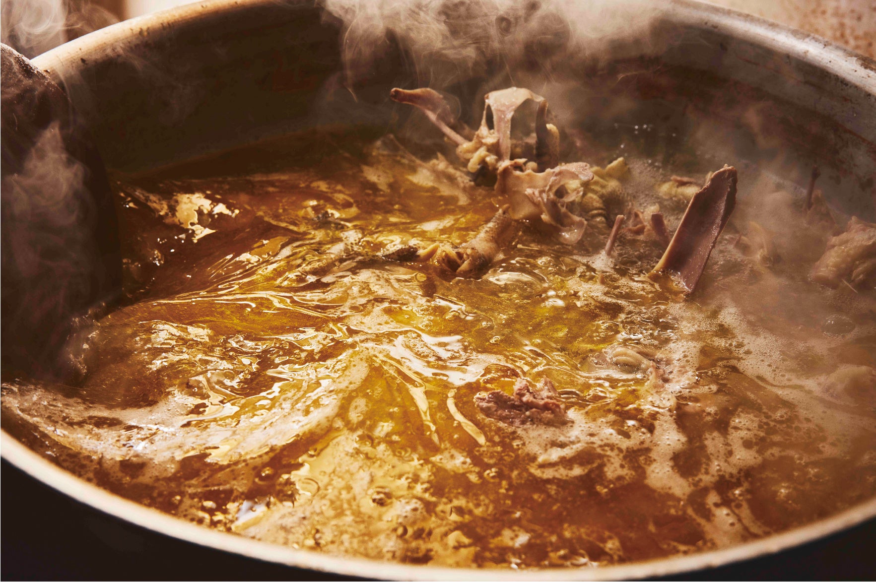 良質な品高い味わいの雌のガラと、野性味があり、深い味わいの雄のガラ半分づつじっくりと煮込み、鶏本来の味わいを存分に引き出した黄金色のスープが完成しました。