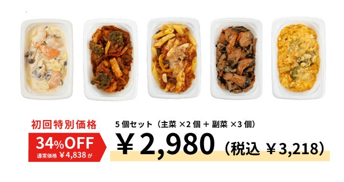 通常5個セットで4,480円(税込4,838円)のところ、初回限定で34%OFFの『2,980円(税込3,218円)』となります。