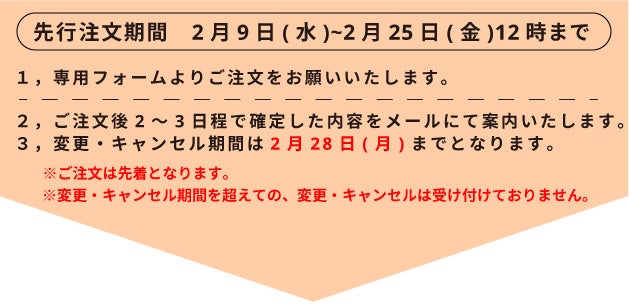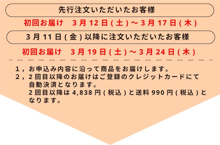 ※2回目以降の商品のキャンセルをご希望の場合は3月9日(火)までがキャンセル期間となります。キャンセルについては、ご注文確定後のメール内に記載の「キャンセルフォーム2回目」よりお願いいたします。