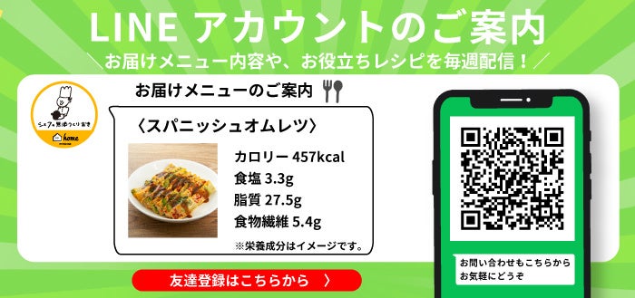 『シェフの無添つくりおき』公式LINEでは、毎週お届けするメニューの詳しい内容など最新情報を配信していきます。ここでしか見れないとっておきの情報も盛りだくさん!