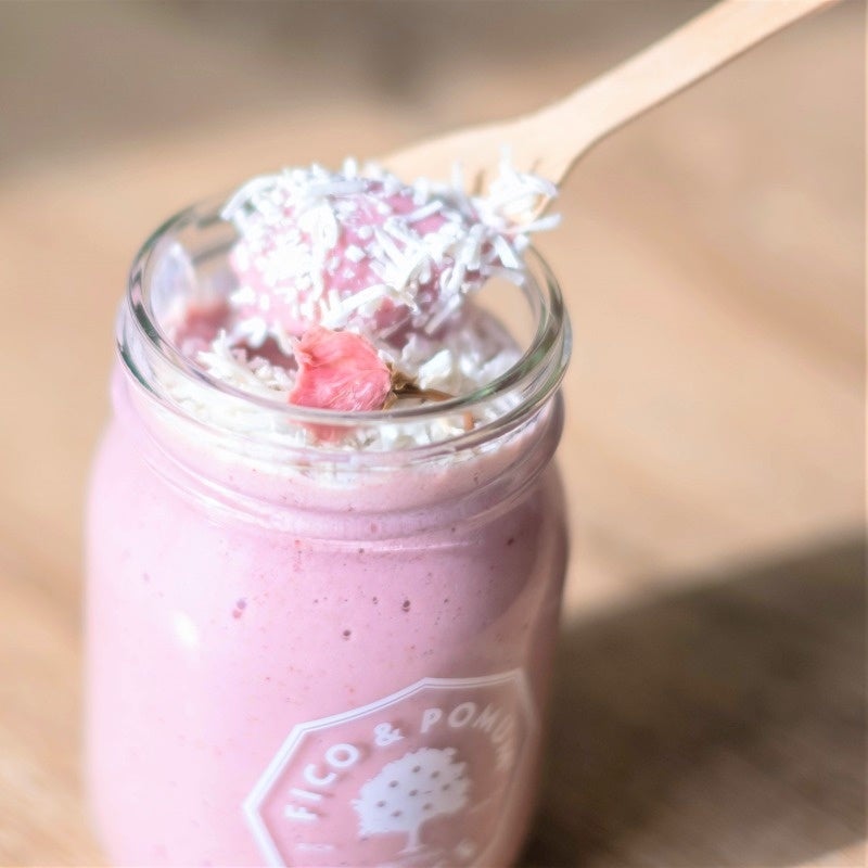 フィコ&ポムムでは、2018年から3月~4月の期間限定で「さくらスムージー」を販売しています。春だけの限定商品として、発売以来多くのお客様に愛されています。甘酸っぱいストロベリーとアメリカンチェリーを組み合わせた淡いピンク色のスムージーに、ほんのり塩味の効いた生のさくらの葉、サクサク食感で風味の良いドライココナッツをたっぷりかけて仕上げています。ジューシーな甘さが広がり、さっぱりした口当たりで飲みやすく、さくらフレーバーの華やかな香りに包まれて気分が高まる贅沢なスムージーです。また、お好みでスムージーにプラスするブースターオプション(74円~※)も23種類ご用意している他、価格や使用材料はそのままに「RICH」または「LIGHT」の2種類の質感でご提供いたします。「RICH」は、贅沢で濃厚な質感。「LIGHT」は、冷たすぎず、なめらかでやさしい質感。自由にアレンジを加えて、「さくらスムージー」をお楽しみください。