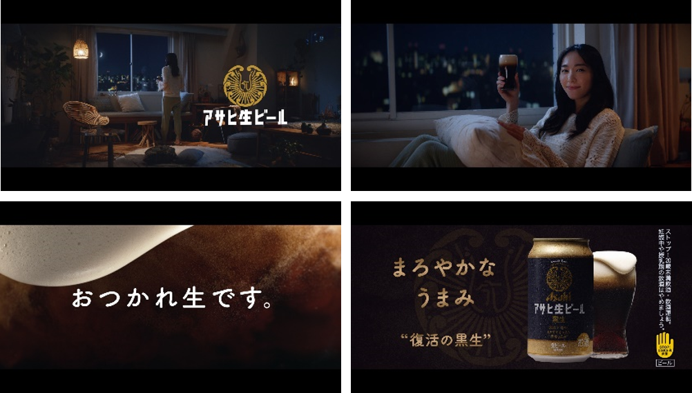「黒生でおつかれ生です」篇は、自宅でリラックスした時間を過ごす新垣さんが窓から月を眺めているシーンから始まります。行きつけのバーのカウンターでビールを飲んでいる時を思い出しながら、ビールをグラスに注いだ新垣さんが「今日の自分に、おつかれ生です」と語りかけ、ビールを飲む様子を描いています。CMの最後に“まろやかなうまみ”という味わいの特長を訴求するとともに、新垣さんのホッと落ち着いた表情を通じて“ぬくもりのある世界観”を演出しています。