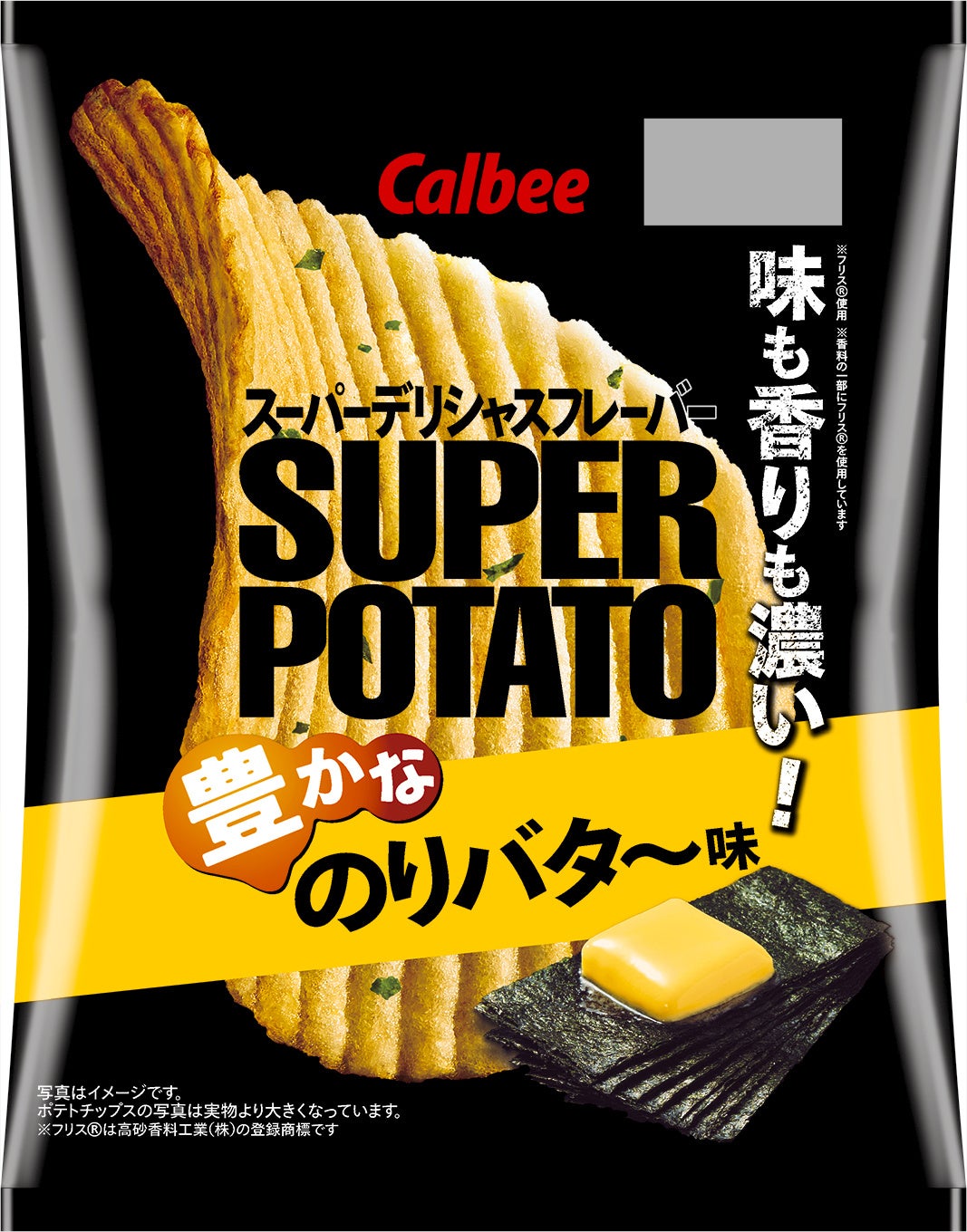 ●『スーパーポテト 豊かなのりバタ~味』は、焼きのりの豊かな香りとバターのコクが味わえるポテトチップスです。和洋のフレーバーを組み合わせた、甘じょっぱい味わいが楽しめます。