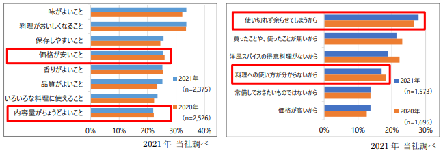使い切れず余らせる不満が最も多く、「購入したことがない」「洋風スパイスを使った得意料理がない」「使い方が分からない」ことに起因した非購入理由が多く挙げられています。