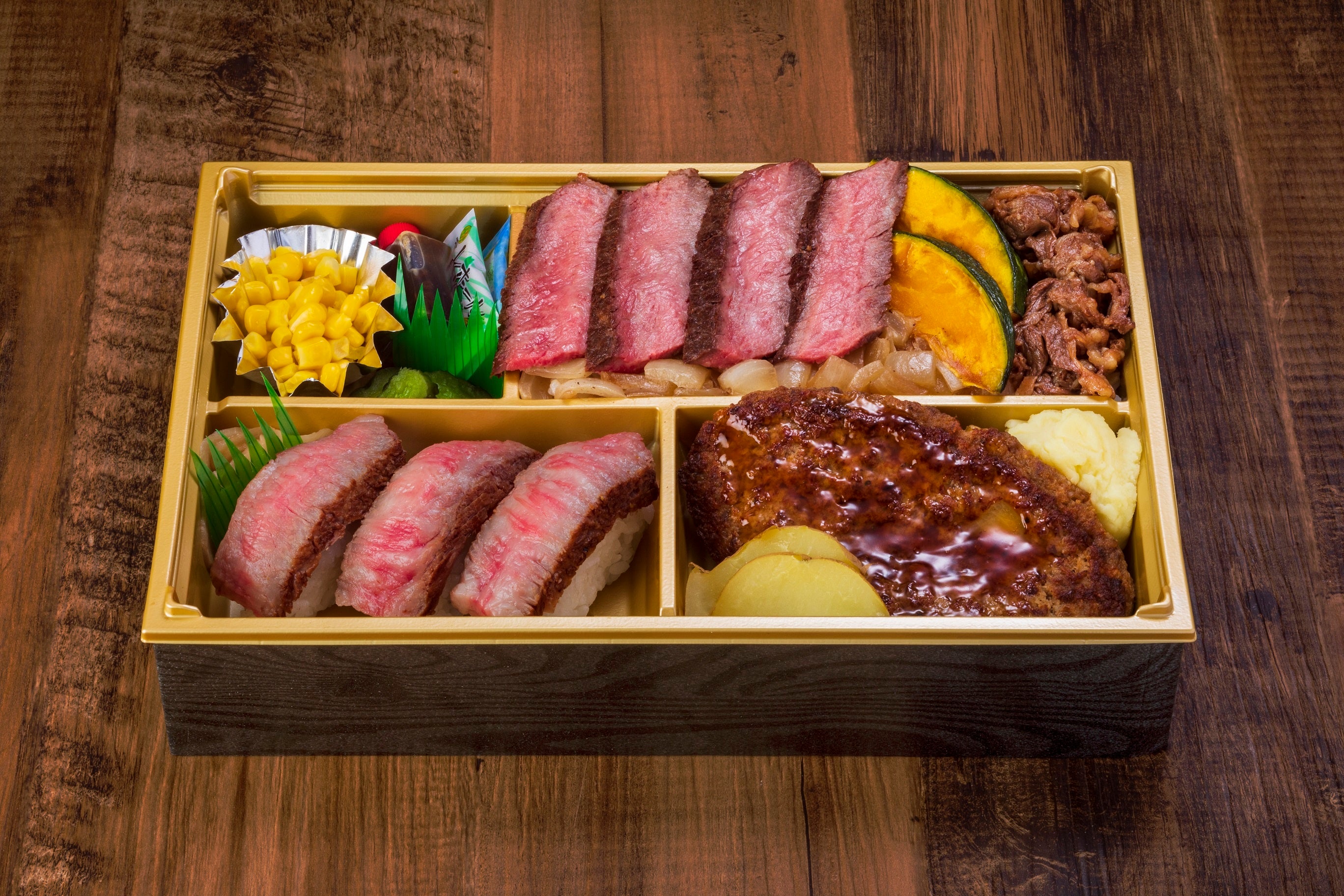 白老牛のサーロインステーキ、赤身ステーキ寿司、牧場自家製のハンバーグ、香味焼きを一度に楽しめる贅沢なお弁当です。