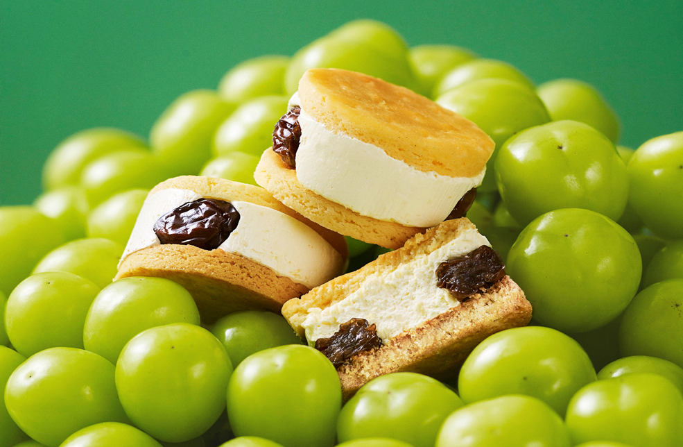山梨県・アグベル 丸山農園のシャインマスカットを使用した贅沢なバターサンドウィッチ。出荷作業中に房からこぼれ落ちてしまった大きなシャインマスカットの粒をセミドライに加工したレーズンを使用しています。ラム酒に漬けたシャインマスカットを贅沢に使用。存在感のある大粒のシャインマスカットを噛むたびに、甘さと香りが口の中に広がります。