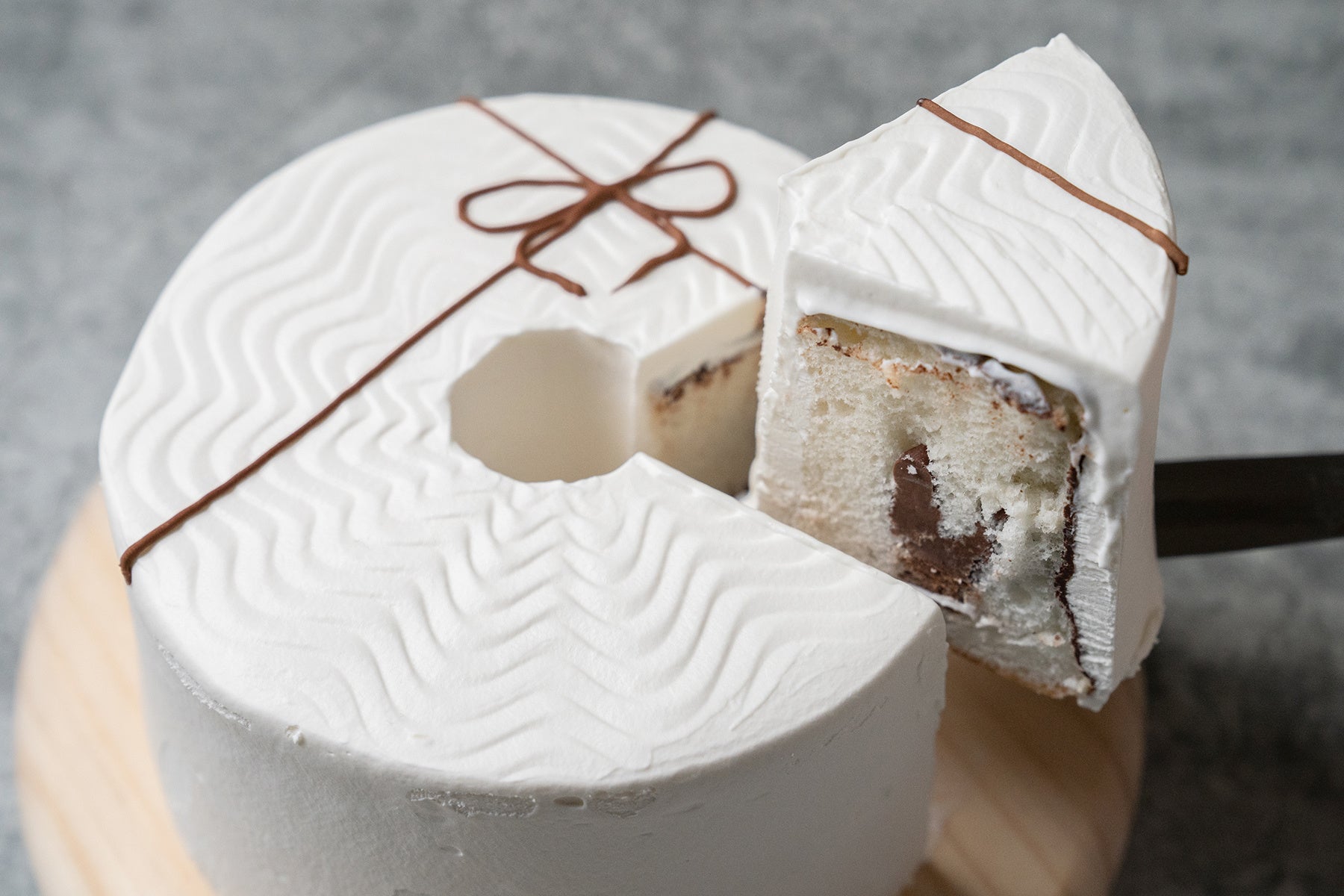 「Neige」はフランス語で「雪」。Chocolat Neigeは、しっとりふわふわで真っ白なシフォン生地に生チョコレートのアクセントを加え、ビターチョコレートのコーティング層をプラスしたチョコシフォンケーキです。天面にあしらわれたチョコ―レートのリボンが非日常感を演出します。まるでプレゼントBOXを開けるかのようにカットしてお召し上がりいただけます。