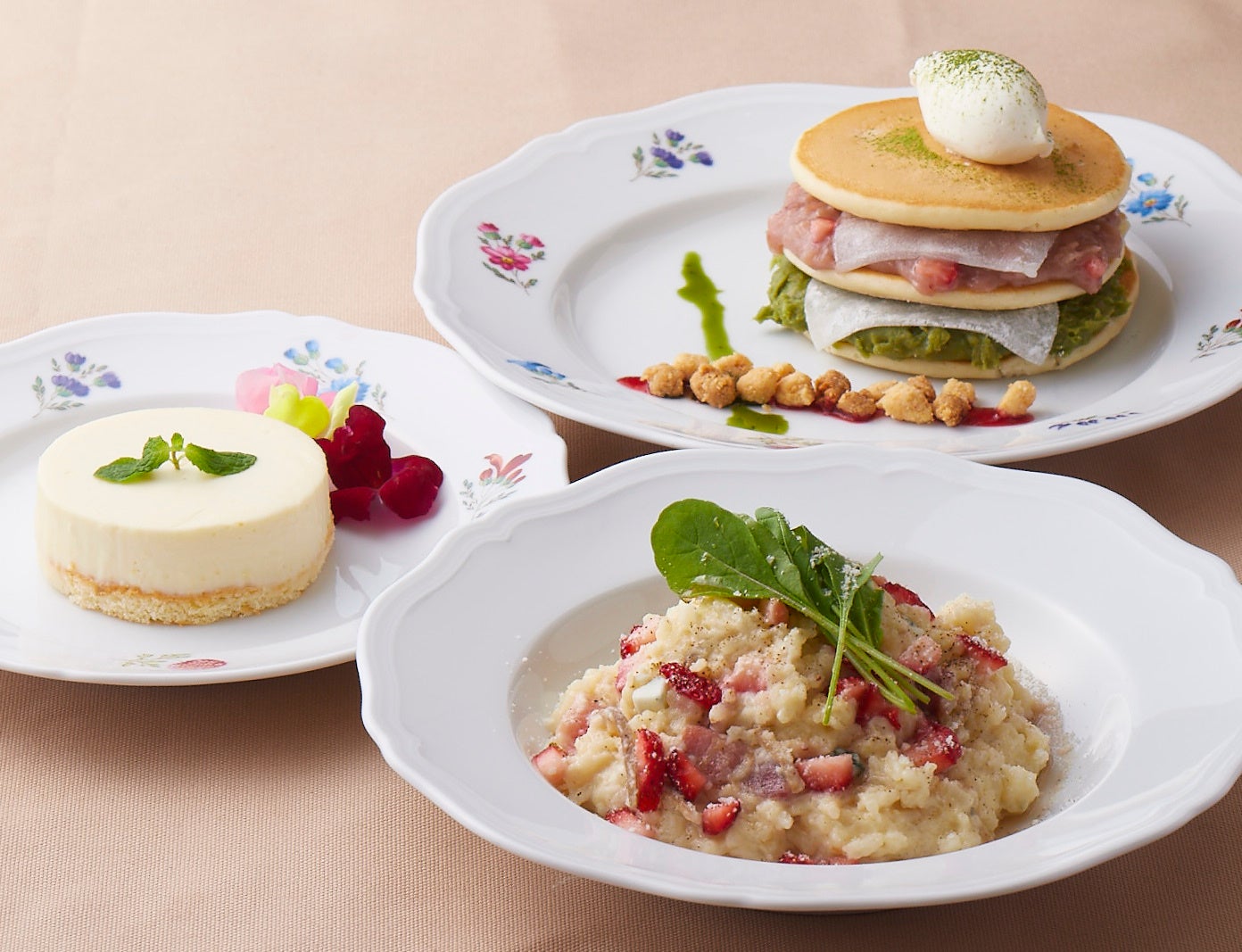 色鮮やかないちごを華やかに使用した「いちごとゴルゴンゾーラのリゾット」は、塩気といちごの甘酸っぱさがマッチしたクリームリゾットです。また、今回のフェアで初めて手がける和と洋をかけ合わせた和風オリジナルパンケーキ「いちごと抹茶の春パンケーキ」は、白いんげんでいちごと抹茶の餡を作り求肥と重ねました。ほどよい弾力とふわふわな生地で重ねた爽やかで上品な白あんの甘みをお楽しみいただける一品です。
