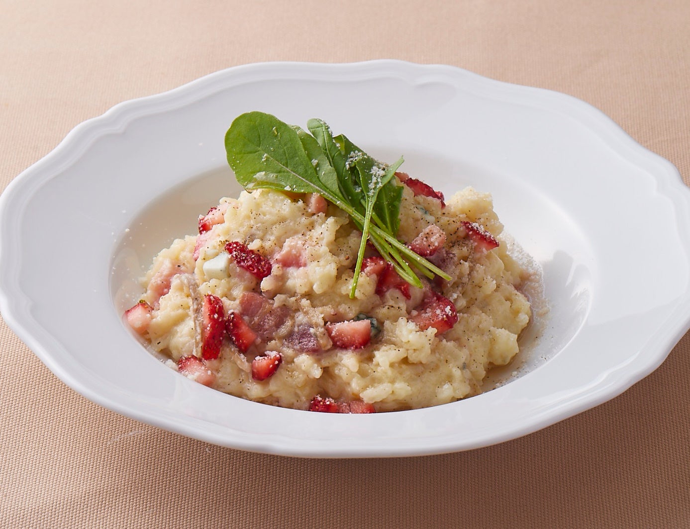パンチェッタの塩気といちごの甘酸っぱさがマッチしたクリームリゾットです。いちごを漬けたはちみつをかけて、味の変化をお楽しみください。