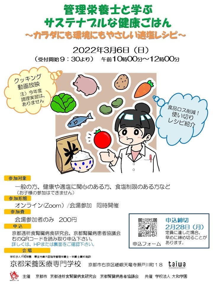 2022年3月6日(日)、京都市右京区の京都栄養医療専門学校にて「カラダにも環境にもやさしい適塩レシピ」をテーマに講習会を行います。クッキング動画の放映やレシピ紹介を通じて、おいしくサステナブルな健康ごはんを京都栄養医療専門学校の管理栄養士といっしょに学びましょう!会場参加/オンライン参加の同時開催なので、ご自宅からでも参加OK!食塩制限のある方、健康や適塩に関心のある方のご参加をお待ちしております。