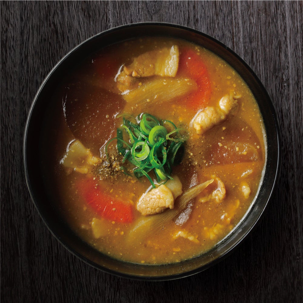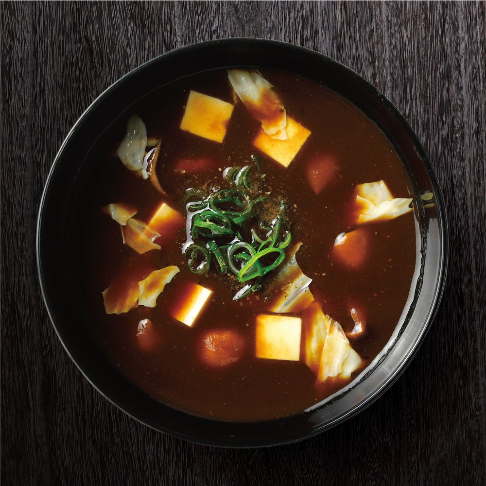 京都 西京味噌の赤だしと麹味噌を合わせました。大豆の香りと米麹由来の甘味が印象的な口当たり。たっぷりと入った食材に、ぴりっと効いた山椒が調和する、贅沢な味わいをご堪能ください。