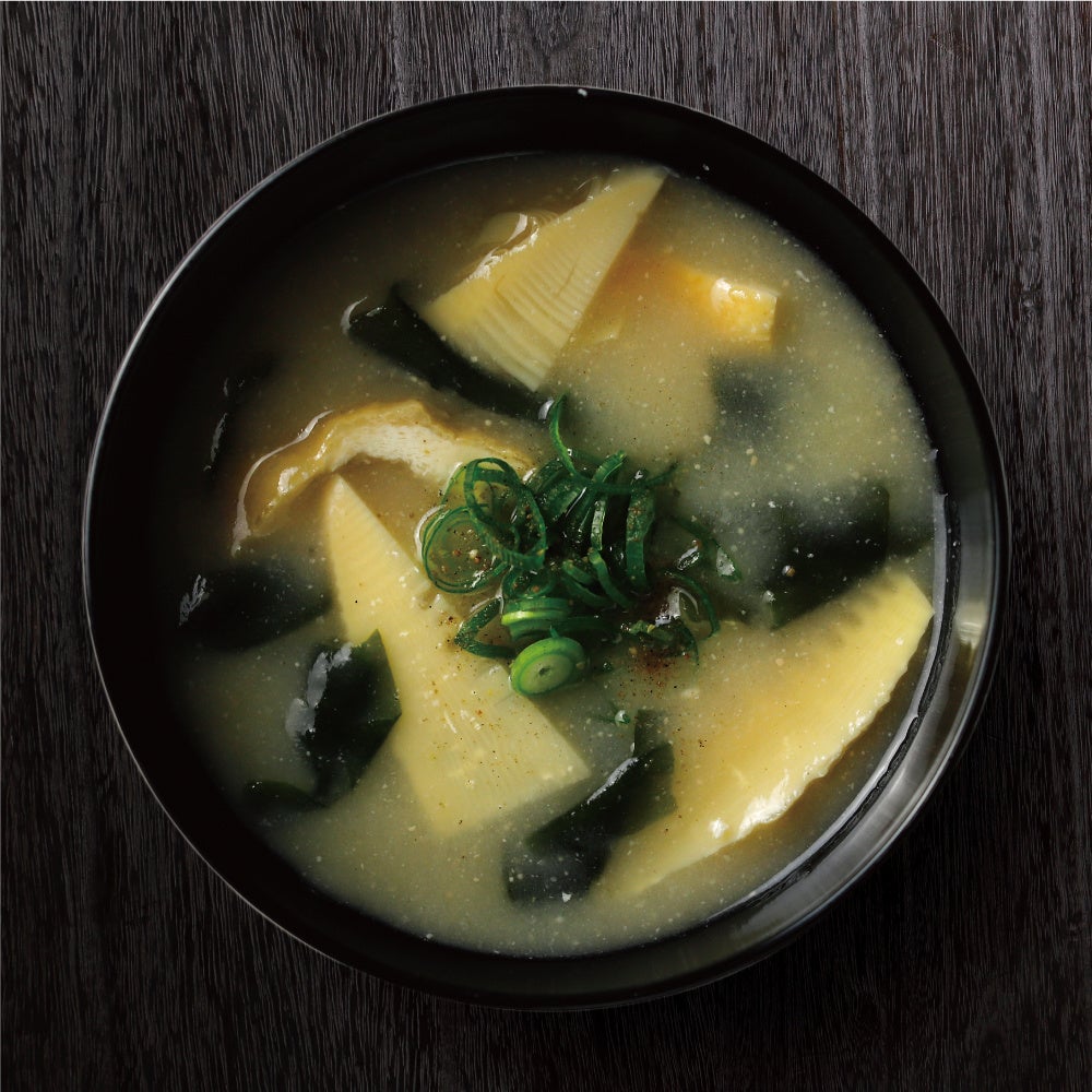 京都 西京味噌の中辛味噌をベースに、深みのあるコクと、まろやかな白味噌の甘味をバランスよく仕立てました。若竹煮を連想させる、相性の良い筍と若布の組み合わせ。滋味豊かな季節の美味しさが際立つお味噌汁です。