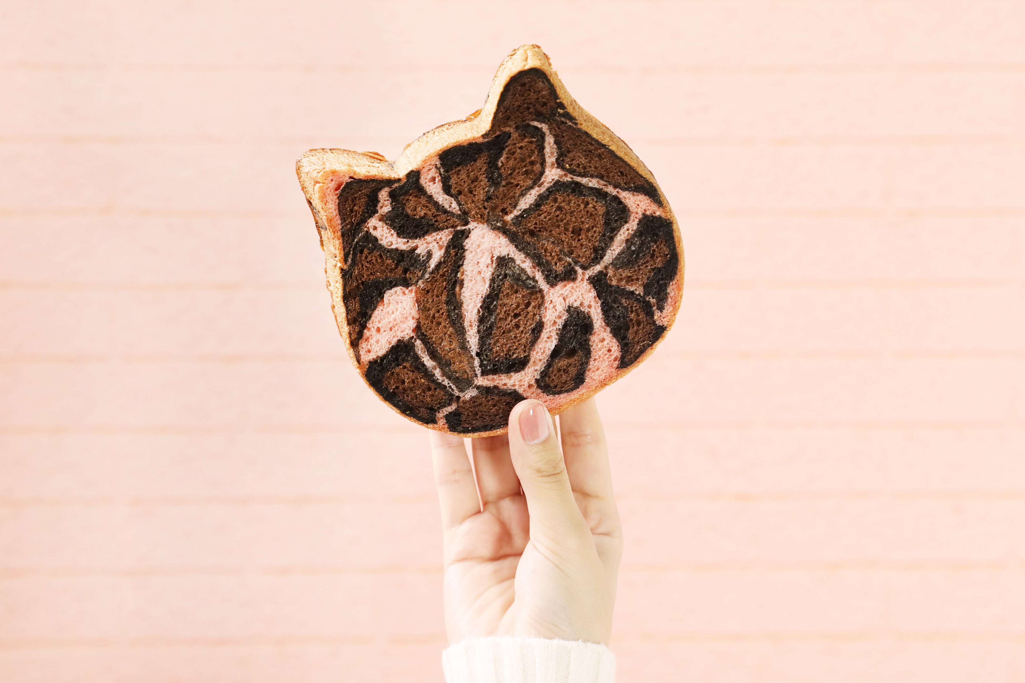 「ねこねこ食パン ピンクのヒョウ」は、いちご、ココア、ブラックココアの3種類の生地を使用した一度に3種の味わいをお楽しみいただける贅沢なねこねこ食パンです。ミルク100%を使用したミルキーな味わいにブラックココアでほんのりとビターな味わいをプラス。ほのかに香るいちごの風味が全体を甘く優しく包みこんでくれます。