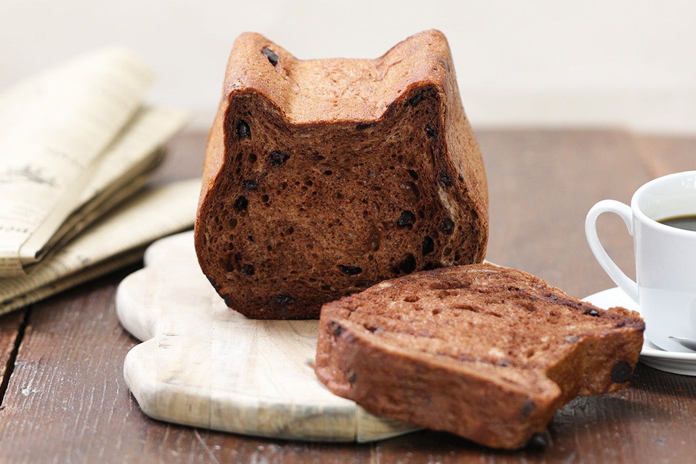 生地にココアパウダーを入れることでよりチョコ感がアップ!チョコ好きな方におすすめしたいねこねこ食パンです。白いチョコペンで表情を描いたら黒ねこのようなねこさんが出来上がり。