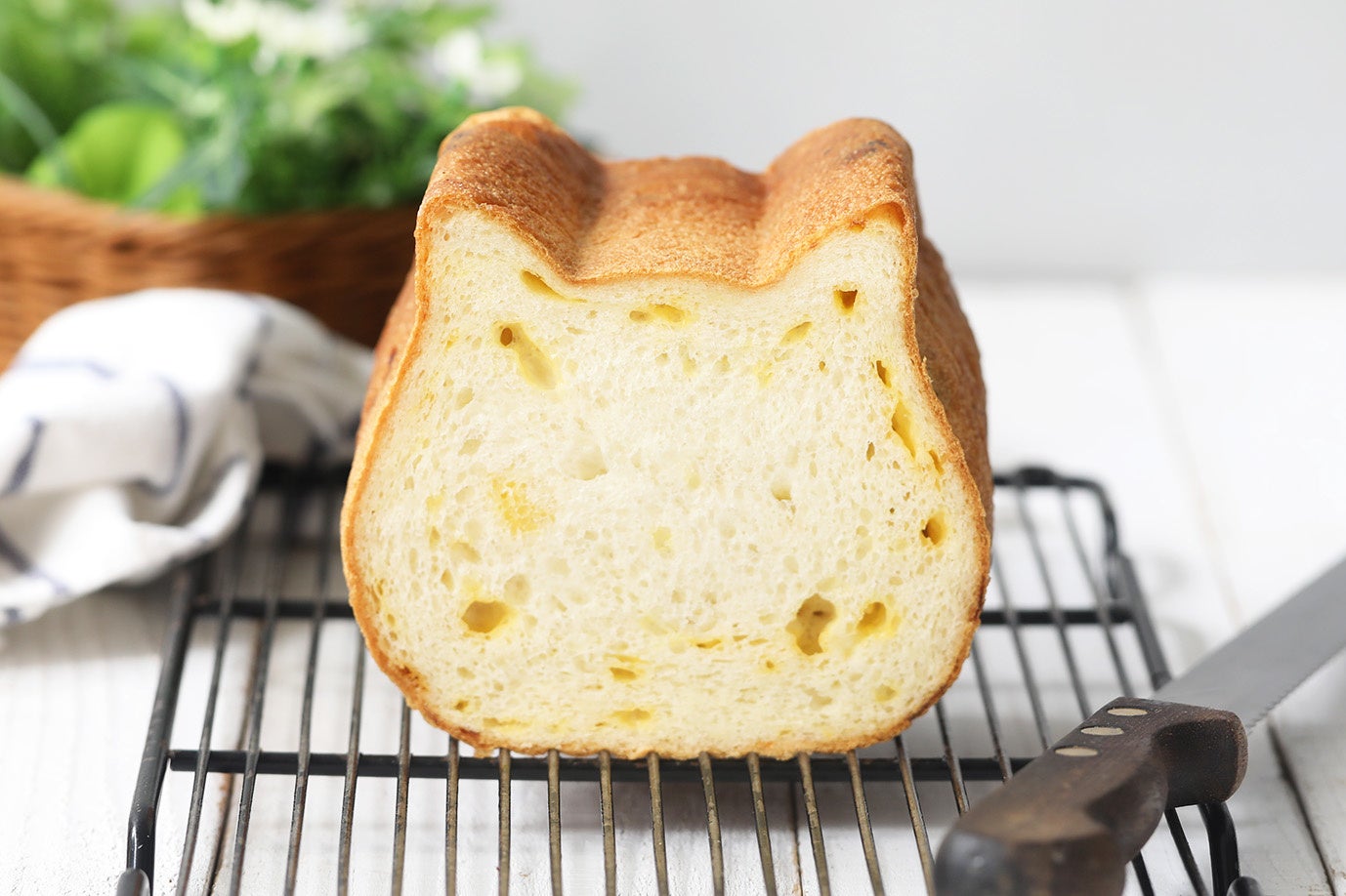 見た目だけではなく、おいしさを追求して、水分はミルクのみ。小麦も国産にこだわり、はちみつ、生クリーム、バター、隠し味にマスカルポーネチーズを使用しました。ひと口食べるとほんのり甘く、ミルクのうまみがじんわり広がるにゃんともおいしい本格派食パンです。