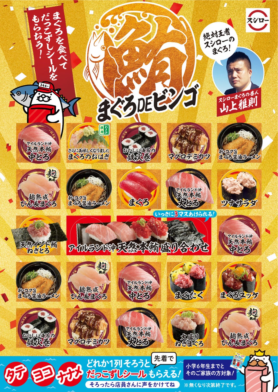 「まぐろDEビンゴ」とは、店舗で配布されるビンゴに掲載されているまぐろ商品を食べてビンゴをクリアすると“だっこずしシール”がもらえる、小学6年生までとそのご家族を対象としたキャンペーンです。